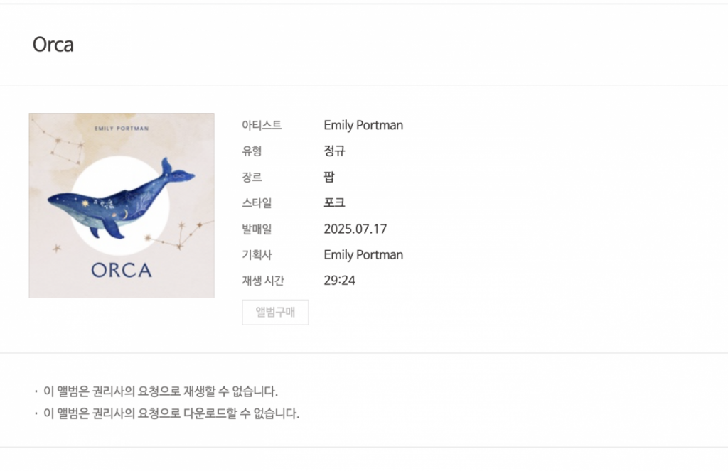 팬이 알려준 링크를 따라 들어가자 음원 사이트에는 '오르카(Orca)'라는 앨범이 포트먼의 이름으로 등록돼 있었다. 10곡이 수록된 이 음반은 제목과 스타일이 실제 포트먼의 음악과 유사했지만, 목소리와 연주가 어색했다.