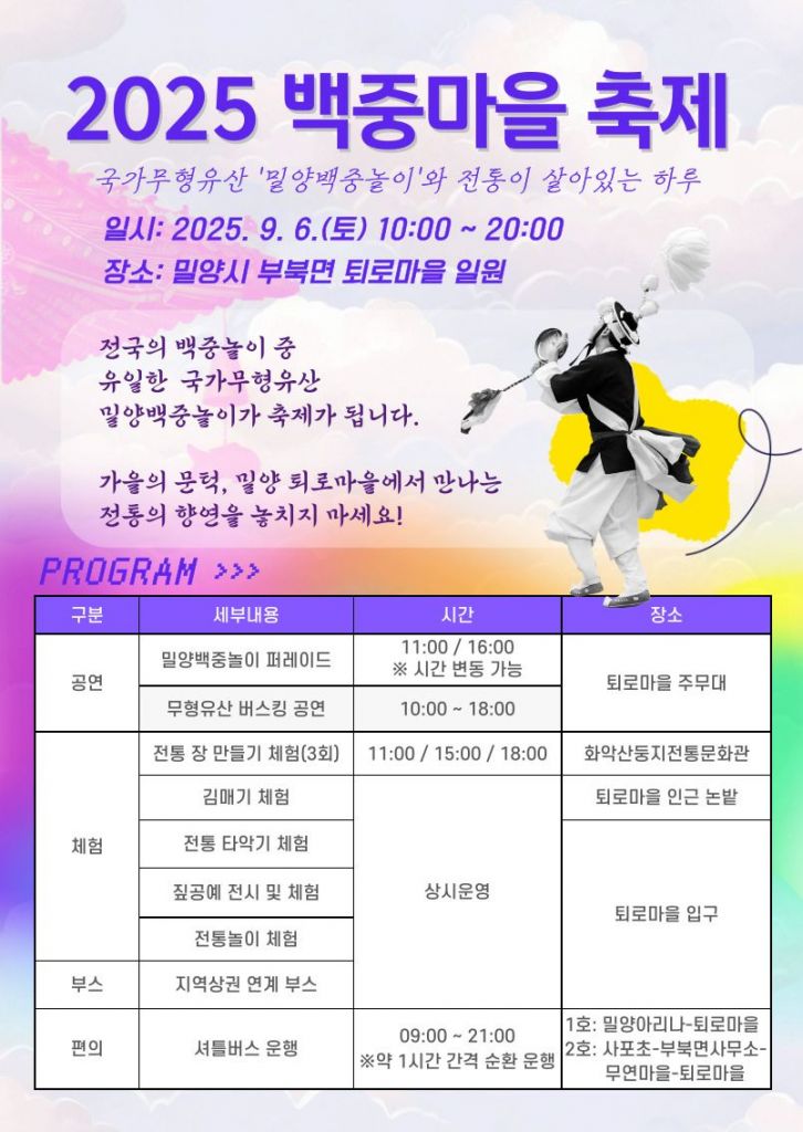 이번 축제는 밀양문화관광재단 주관으로 열리며, 밀양백중놀이를 시민과 관광객이 함께 즐기고 계승하는 장으로 마련됐다.