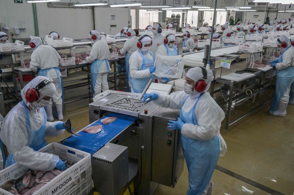 브라질 히파이나에 위치한 한 수산물 회사 작업장에서 근로자들이 틸라피아를 손질하고 있다. AFP연합뉴스