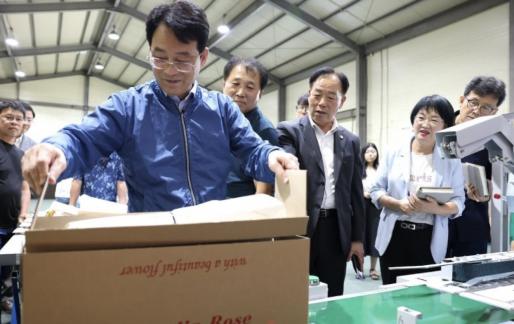 강진원 강진군수가 장미 직거래 포장 자동화 장비 ‘제함기’ 시연회에서 박스 포장 과정을 살펴보고 있다. 강진군 제공