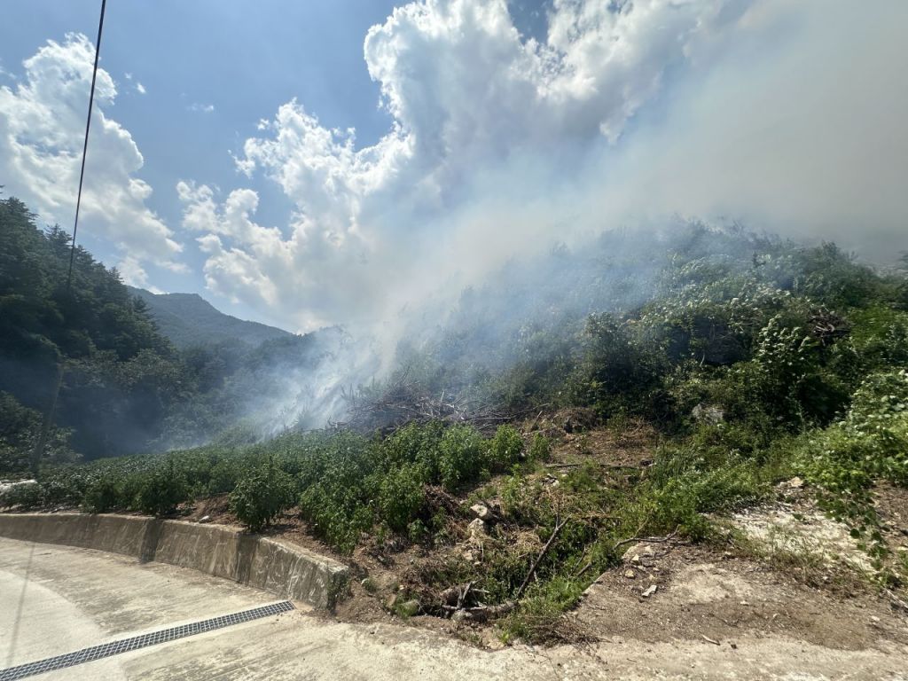 25일 오전 11시 54분께 삼척시 가곡면 오목리 한 야산에서 불이 나 산림과 소방당국이 인력 160여 명, 진화차량 50여 대, 헬기 6대를 투입해 오후 6시 30분께 주불을 잡았다.