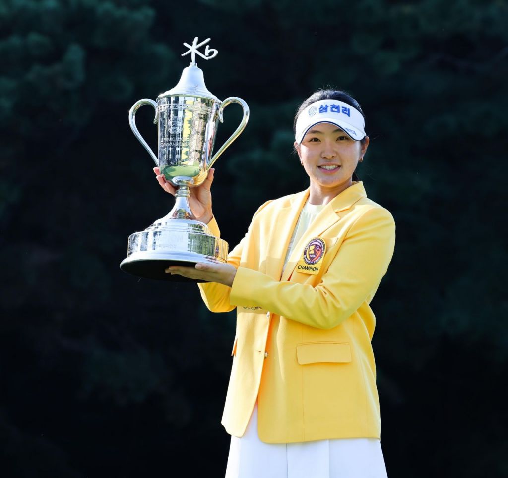 유현조가 작년 KB금융 스타챔피언십 우승 직후 트로피를 들고 환하게 웃고 있다. 사진제공=KLPGA