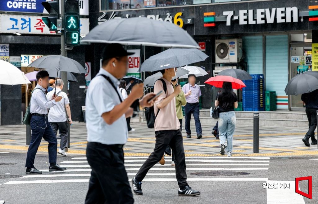 서울을 비롯한 중부지방에 본격적으로 장맛비가 내리기 시작한 16일 서울 강남역 네거리 인근에서 시민들이 우산을 쓰고 이동하고 있다. 기상청은 이번주 내내 중부지방에 강한 비가 내리겠다고 예보했다. 사진=조용준 기자 jun21@