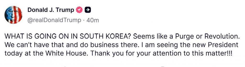 트럼프 대통령은 이날 자신이 만든 사회관계망서비스(SNS) 트루스소셜에서 "한국에서 무슨 일이 벌어지고 있는가. 우리는 거기서 사업을 할 수 없다"며 이같이 썼다.