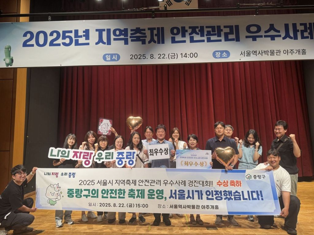 서울 중랑구(구청장 류경기)가 서울시 주관 ‘2025년 지역축제 안전관리 우수사례 경진대회’에서 최우수상을 수상했다. 이번 대회는 자치구의 축제 안전관리 사례를 평가해 모범적인 운영사례를 선정하는 자리로, 외부 전문가가 심사에 참여했다.