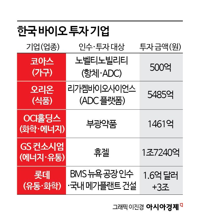 식품기업 오리온은 이미 지난해 레고켐바이오(현 리가켐바이오) 지분 25%를 약 5485억 원에 매입하며 최대주주로 올라섰다. 리가켐바이오는 다국적 제약사와 13건, 10조원이 넘는 기술이전 계약을 성사시킨 바 있어 오리온의 투자는 식품기업이 바이오를 차세대 축으로 삼았음을 단적으로 보여주는 사례로 꼽힌다.