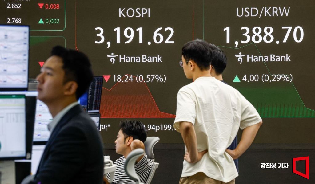 코스피 지수가 전 거래일 대비 9.94포인트 하락한 3199.92에 장을 시작한 26일 서울 중구 하나은행 본점 딜링룸에서 딜러들이 업무를 보고 있다. 이날 원달러 환율은 전 거래일 대비 6.3원 상승한 1391원으로 거래를 시작했다. 2025.8.26 강진형 기자