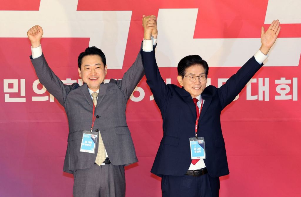 국민의힘 장동혁(왼쪽), 김문수 당 대표 후보가 26일 서울 여의도 국회도서관에서 열린 제6차 전당대회 결선에서 손을 맞잡고 인사하고 있다. 연합뉴스