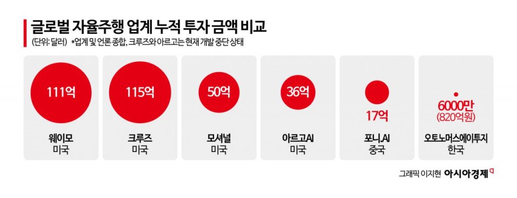 27일 업계에 따르면 글로벌 자율주행 1위 업체인 구글 웨이모의 누적 투자 금액은 110억달러(15조원), 현대차그룹이 투자한 미국 자율주행 업체 모셔널은 50억달러에 달한다. 국내에서 테스트를 진행 중인 중국 기업 포니.AI도 최소 17억달러 이상의 투자를 유치한 것으로 나타났다. 반면 국내에서 가장 많은 투자를 유치한 오토노머스에이투지의 누적 투자 금액은 6000만달러(820억원)에 불과하다. 1위 업체인 웨이모 투자 금액의 1%도 안 된다.