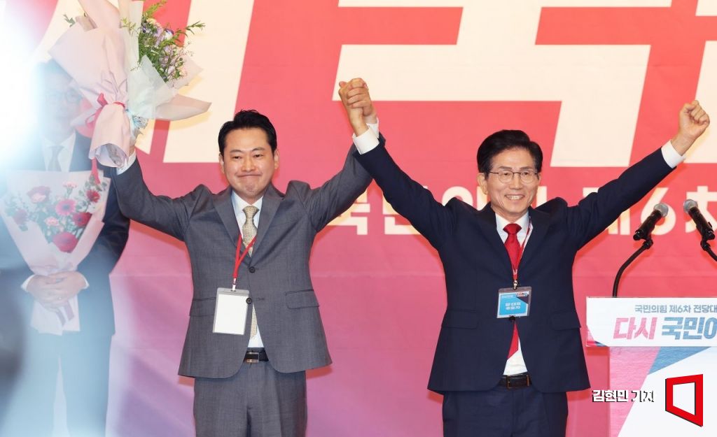장동혁 국민의힘 신임 당 대표(왼쪽)가 26일 서울 여의도 국회도서관에서 열린 국민의힘 제6차 전당대회 결선에서 선출된 뒤 경쟁했던 김문수 후보와 함께 당원들을 향해 인사하고 있다. 국회사진기자단