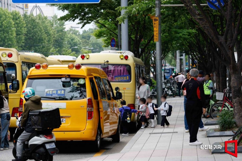 23일 서울 양천구 목동 학원가에서 영어유치원을 마친 어린이들이 하원 하고 있다. 강진형 기자