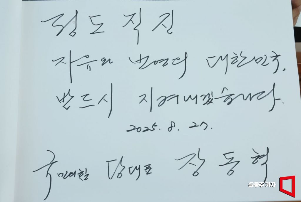 장동혁 국민의힘 신임 대표가 27일 서울 동작구 국립서울현충원에서 현충탑을 참배를 마친 후 방명록을 작성하고 있다.