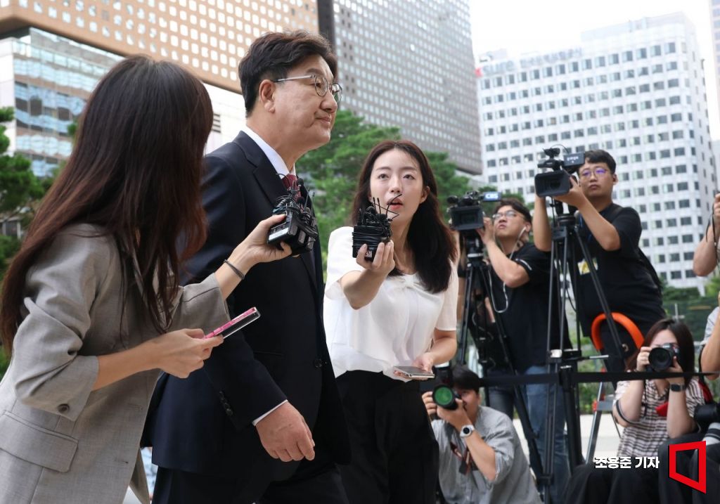 정치자금법 위반 혐의를 받고 있는 권성동 국민의 힘 의원이 27일 서울 종로구 KT 광화문 빌딩에 마련된 김건희 특검 사무실로 출석하고 있다. 통일교 관련 의혹으로 현직 국회의원이 특검 조사를 받는 것은 이번이 처음이다.