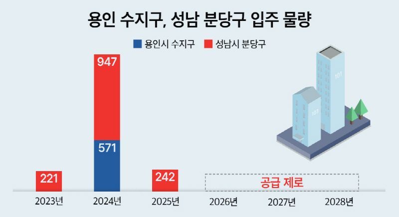 부동산시장 분석업체 부동산인포에 따르면 올해 성남 분당구에서 입주가 예정된 아파트는 7월 입주에 돌입한 분당구 야탑동 공공분양 '분당 아테라'(242가구)가 유일하다. 용인 수지구는 신축 아파트 입주 물량이 전무하다. 수지구는 'e편한세상 죽전 프리미어포레(430가구)'가 2024년 조성된 것을 제외하면 3년간 100가구 이상 아파트 입주가 없는 상황이다. 분당구·수지구 인구가 85만명에 달하는 것을 감안하면, 사실상 신축이 '제로'인 셈이다.