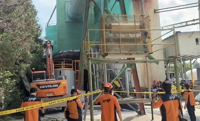 지난 21일 오후 전남 순천시 한 레미콘 회사 내 간이탱크에서 작업자 3명이 쓰러져 있다는 신고가 접수돼 소방당국이 구조를 위해 탱크 해체작업을 하고 있다. 순천소방서 제공