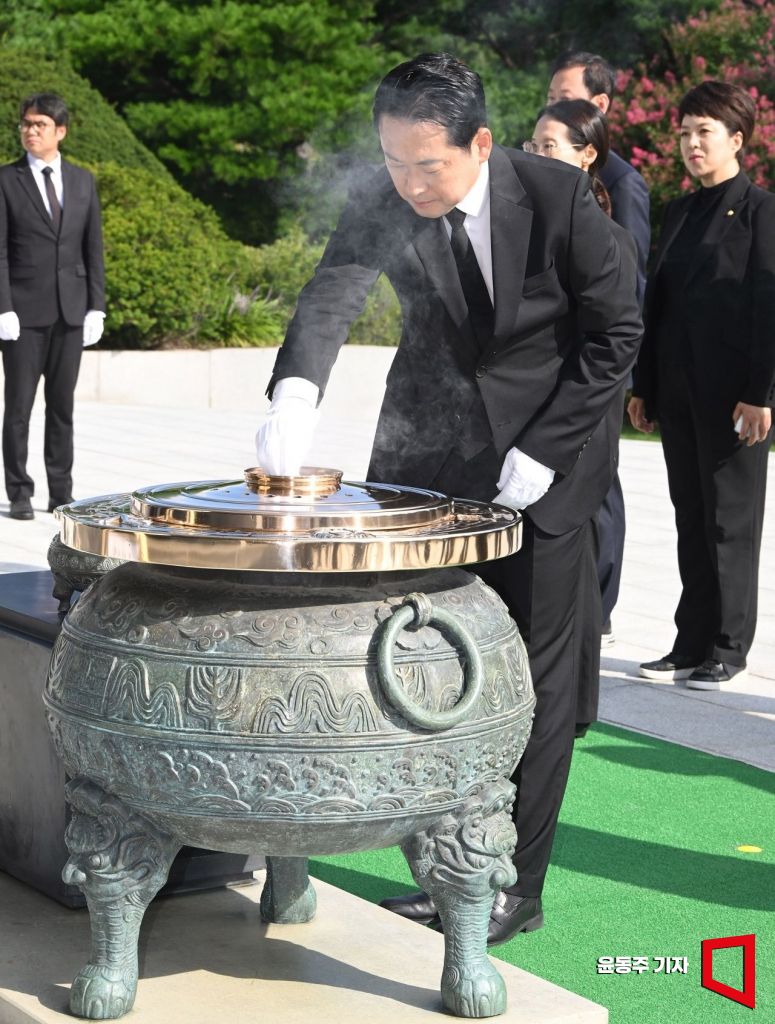 장동혁 국민의힘 신임 대표와 송언석 원내대표 등 당 지도부가 27일 서울 동작구 국립서울현충원에서 현충탑을 참배하고 있다. 2025.08.27 윤동주 기자