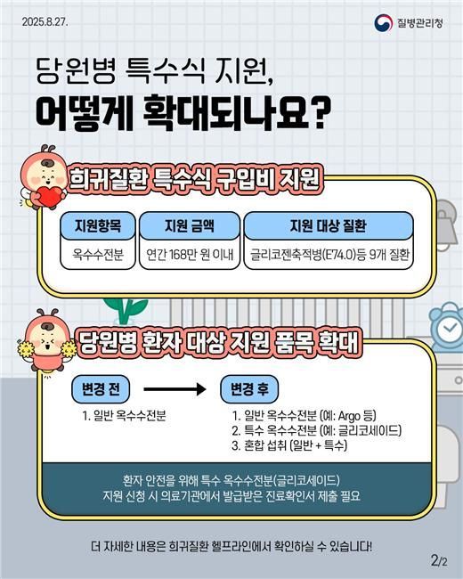 임승관 질병청장은 "당원병 환자에 대한 특수 옥수수전분 지원 확대를 통해 환자들이 야간에도 저혈당 걱정 없이 안정적으로 치료를 이어갈 수 있을 것"이라며 "앞으로도 희귀질환 환자와 가족의 목소리를 잘 경청하고, 환자의 삶을 정책의 중심에 두고 지원의 사각지대를 지속해서 발굴해 맞춤형 지원을 확대해 나가겠다"고 말했다.