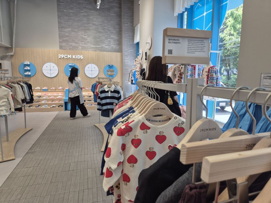 매장은 젊은 부모들의 만족도를 고려했다. 우드톤에 하늘색 포인트 색상이 적절히 섞여 매장 곳곳에 시선이 머물수 있도록 했다. 매대 사이를 넓게 만들어 아이와 부모가 손잡고 거닐 수 있을 정도의 여유 공간도 확보했다. 한쪽에는 29CM에 입점한 키즈 가구 브랜드를 활용해 간이 놀이방도 조성했다. 총 37개의 베이비(0~2세)와 키즈(2~7세) 브랜드를 입점시켰으며 1층은 판매 시설, 2층은 수유실과 놀이방 등으로 운영된다.