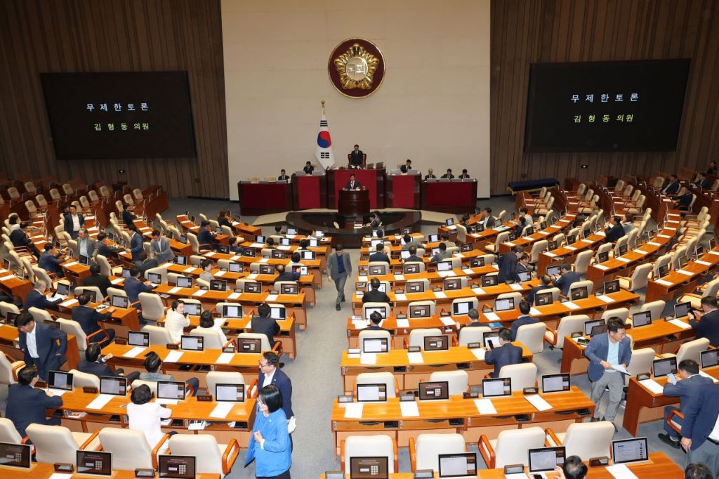 김형동 국민의힘 의원이 지난 23일 서울 여의도 국회 본회의에서 노란봉투법(노동조합 및 노동관계조정법 일부개정법률안)에 대한 무제한 토론을 하고 있다. 연합뉴스.