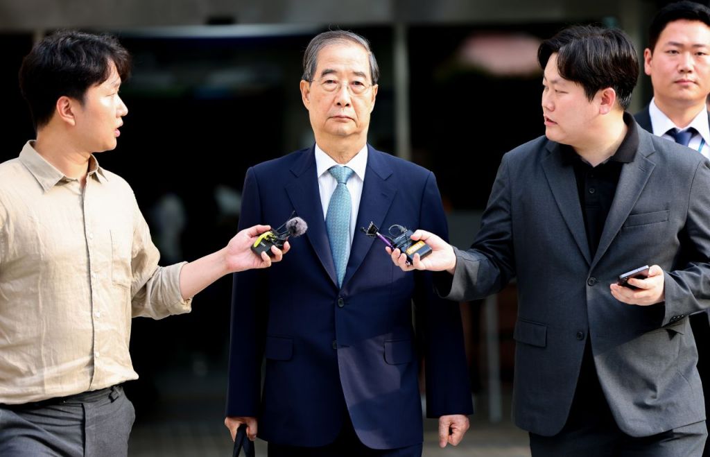 윤석열 전 대통령의 내란 행위 방조 혐의를 받는 한덕수 전 국무총리가 27일 구속 전 피의자 심문(영장실질심사)을 마친 뒤 대기 장소인 서울구치소로 이동하기 위해 서울 서초구 서울중앙지법 청사를 나서고 있다. 연합뉴스