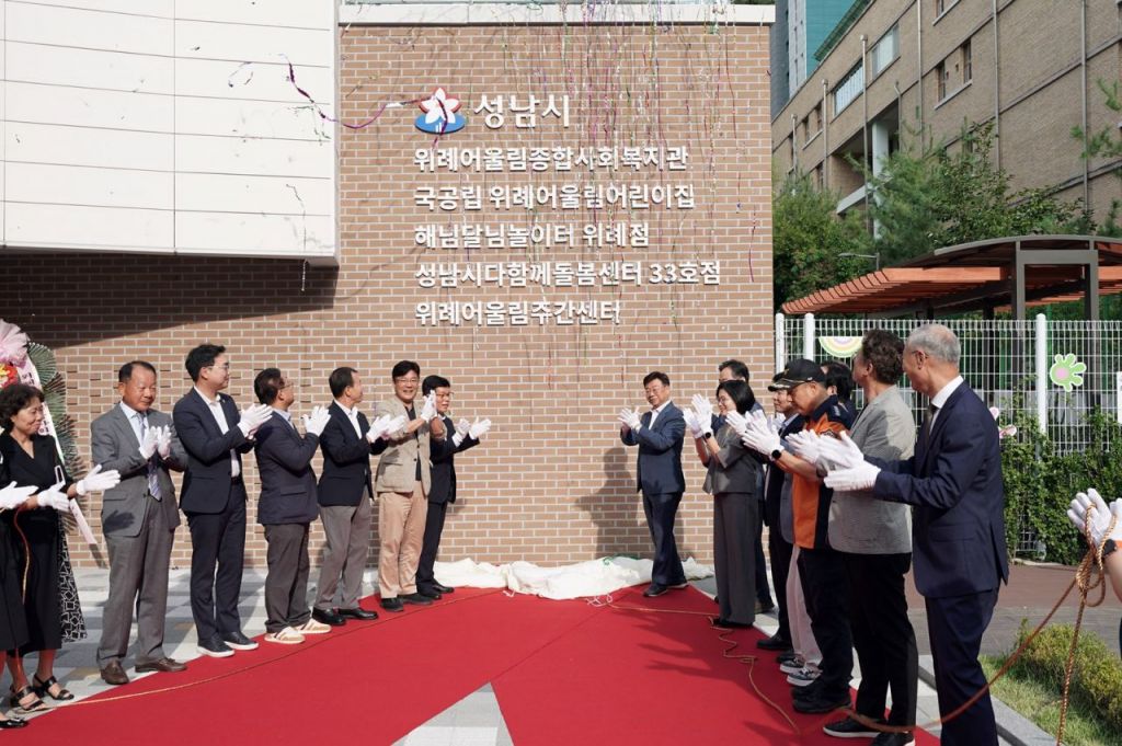 신상진 성남시장과 주요 내빈들이 위례어울림종합사회복지관 현판 제막식을 진행하고 있다. 성남시 제공
