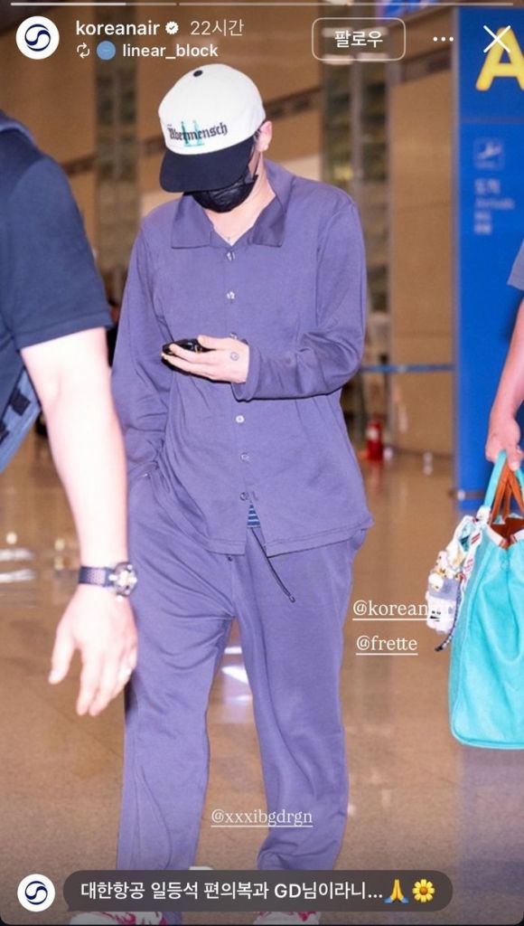 대한항공 일등석에서 제공하는 편의복을 입은 채 입국하는 지드래곤. 대한항공 공식 인스타그램 캡처