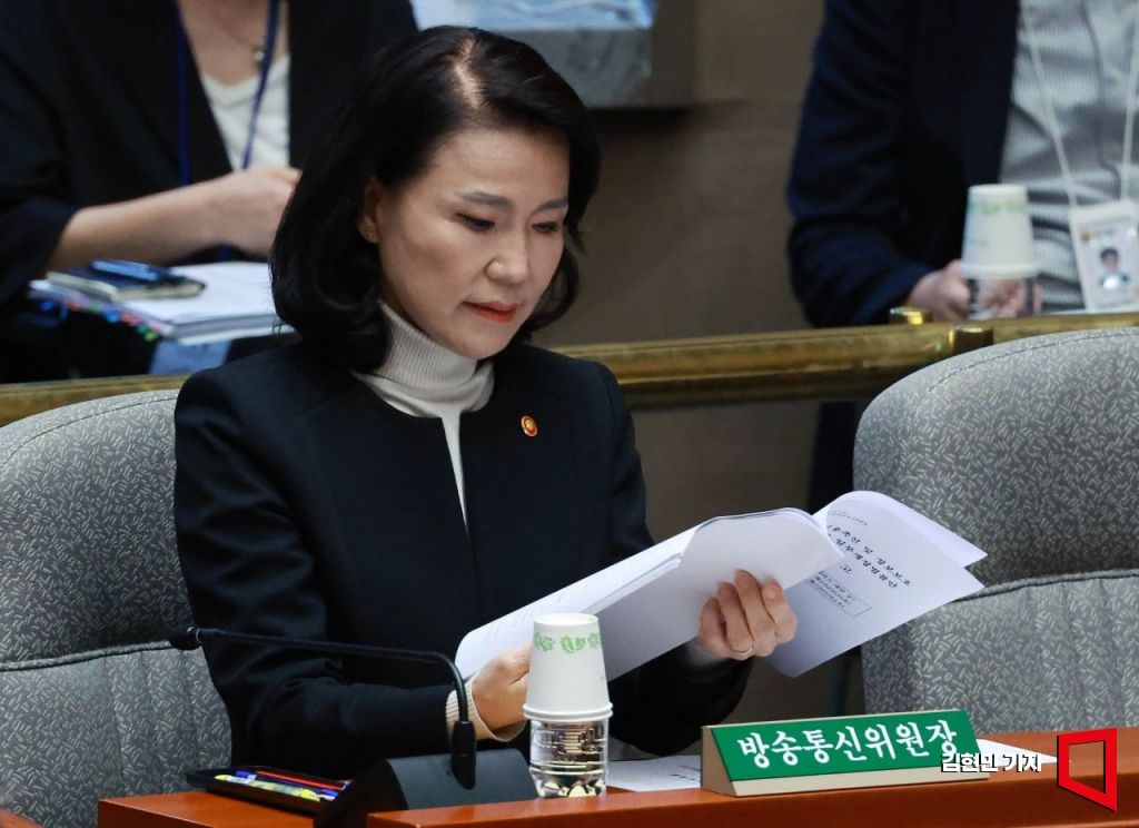 이진숙 방송통신위원장이 지난 20일 서울 여의도 국회에서 열린 과학기술정보방송통신위원회 전체회의에 출석해 의원 질의에 답하고 있다. 김현민 기자
