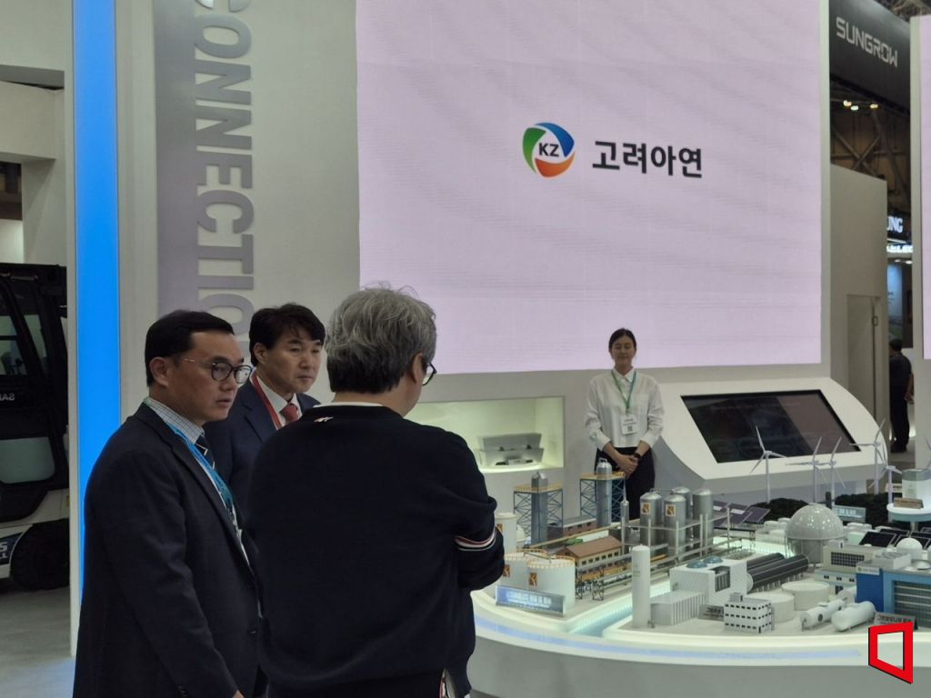 백순흠 고려아연 사장(왼쪽 두번째)이 27일 부산 벡스코에서 열린 '2025 에너지대전' 부스에서 관계자 설명을 듣고 있다. 부산=오지은 기자