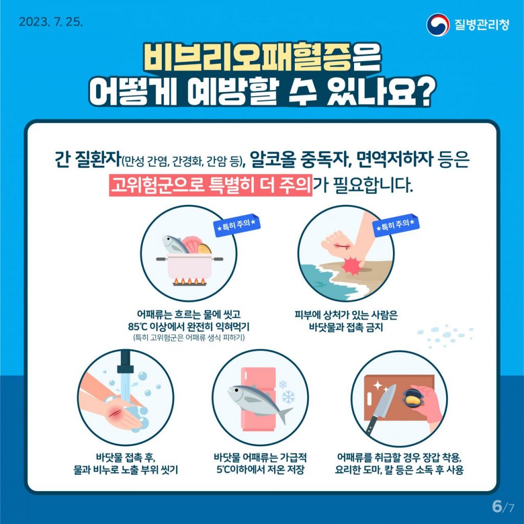 주요 예방수칙은 ▲어패류는 충분히 익혀 먹기 ▲피부에 상처가 있는 사람은 바닷물 접촉을 피하고 접촉 시 깨끗한 물과 비누로 노출 부위 씻기 ▲바닷물 어패류는 가급적 5 ℃이하 보관하기 ▲어패류 취급 시 장갑을 착용하고 사용한 도마 칼 등은 소독 후 사용하기 등이다.