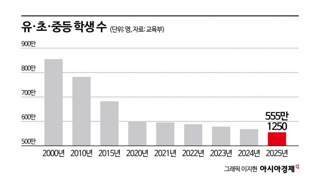 이 결과, 올해 전국 유·초·중·고교 학생 수는 555만1250명으로 전년 대비 2.3%(13만3495명) 줄었다. 유치원생은 48만1525명으로 1만7079명(3.4%↓) 줄었고, 초등학교 학생 수는 234만5488명으로 14만9517명(6.0%↓) 감소해, 중·고등학교 등 다른 학급별 학생 수에 비해 감소 폭이 컸다.