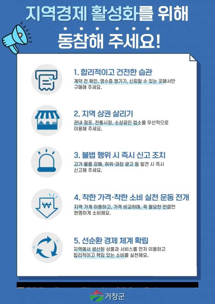 군 관계자는 "군민 모두가 합리적인 소비문화를 실천하고 지역 상권을 적극적으로 이용할 때, 지역경제가 더욱 튼튼해진다"며, "특히 불법적 영업 행위가 의심되는 경우에는 한국소비자원또는 거창군 경제 기업 과로 즉시 신고해 달라"고 강조했다.