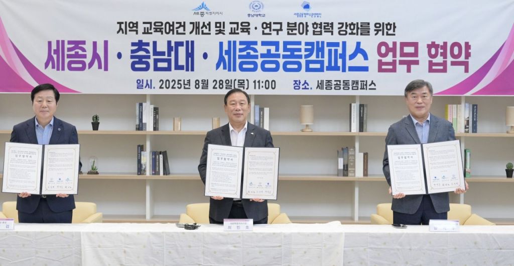 세종시는 충남대학교, 세종 공동캠퍼스운영법인과 지역 교육여건 개선 및 교육·연구 분야 협력 강화를 위한 업무협약을 28일 체결했다. 이 협약은 융·복합 창의인재 전문 인력을 양성하고, 충남대학교와 공동캠퍼스와의 협력으로 지역 교육여건을 향상하고자 마련됐다.