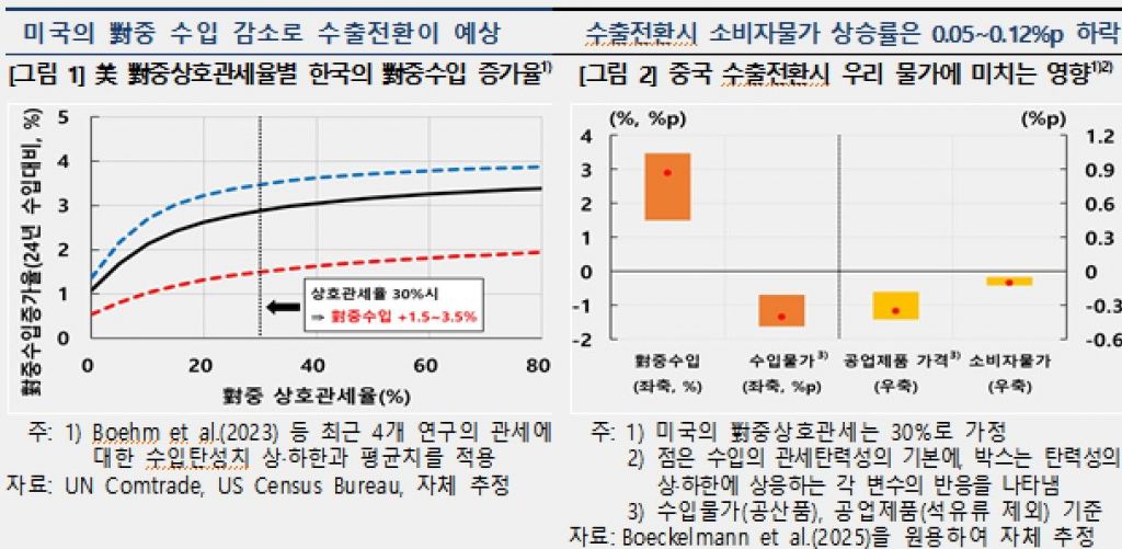 한은은 미국의 세부 수입 품목별 예상 관세율과 관세탄력성을 감안해 관세 인상에 따른 수입 영향을 추정한 결과, 대중 상호관세율이 30%일 경우 미국의 대중 수입은 24.7%에서 최대 56.9%까지 감소하는 것으로 나타났다. 감소분이 우리나라 등 여타 교역국으로 수출 전환된다고 가정하면 우리나라의 대중 수입은 1.5%에서 최대 3.5% 증가가 예상된다.