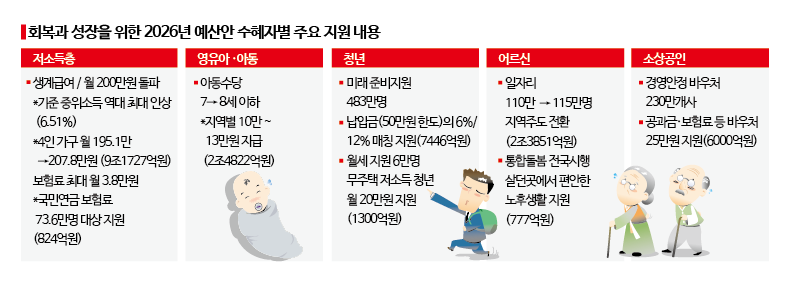 정부는 내년도 예산안에 ‘이재명표’ 청년 자산형성 상품인 ‘청년미래적금’ 신설을 위해 7446억원을 투입한다. 내년부터 청년도약계좌는 신규 가입이 중단되고 청년미래적금이 후속 상품으로 운영된다. 저출산 대응이나 노인 돌봄과 같은 사회 복지 예산도 대폭 늘렸다. 아동수당 지급 연령 확대 등을 위한 저출산 예산은 전년보다 3조원을 확대했고, 노인 대상 통합 돌봄 확대 사업은 전년보다 2조원 가까이 늘렸다.