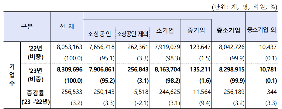 29일 중소벤처기업부는 2023년 기준 중소기업 기본통계 결과를 발표했다. 조사 결과, 국내 중소기업 수는 829만 8915개로 전년 대비 3.2% 증가했고 종사자 수는 1911만 7649명으로 전년 대비 0.9% 늘었다. 같은 기간 매출은 3301조 2545억원으로 0.2% 감소한 것으로 나타났다.