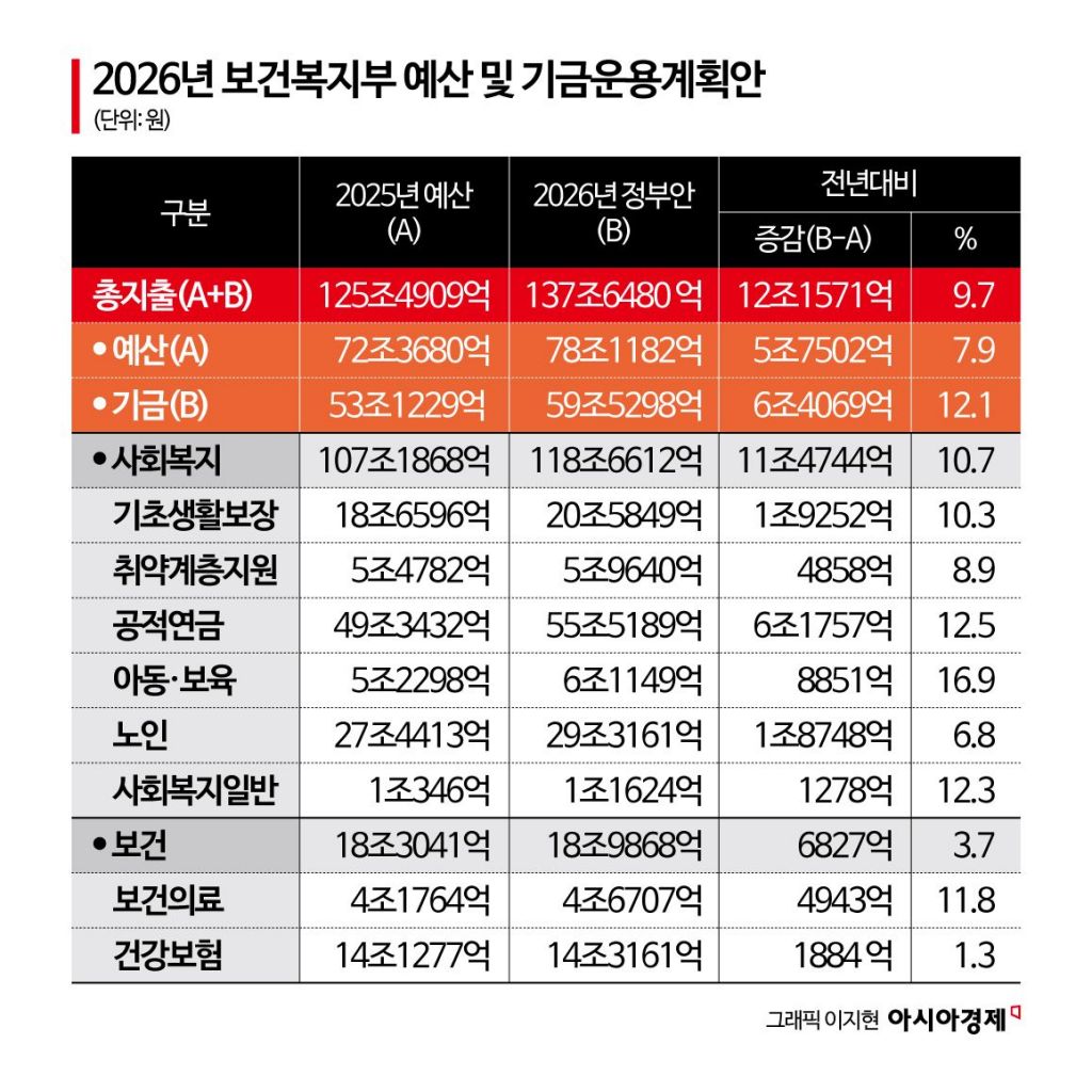 내년 기금을 포함한 보건복지부 예산이 올해보다 10% 가까이 늘어난 137조원으로 역대 최대 규모를 기록할 전망이다.