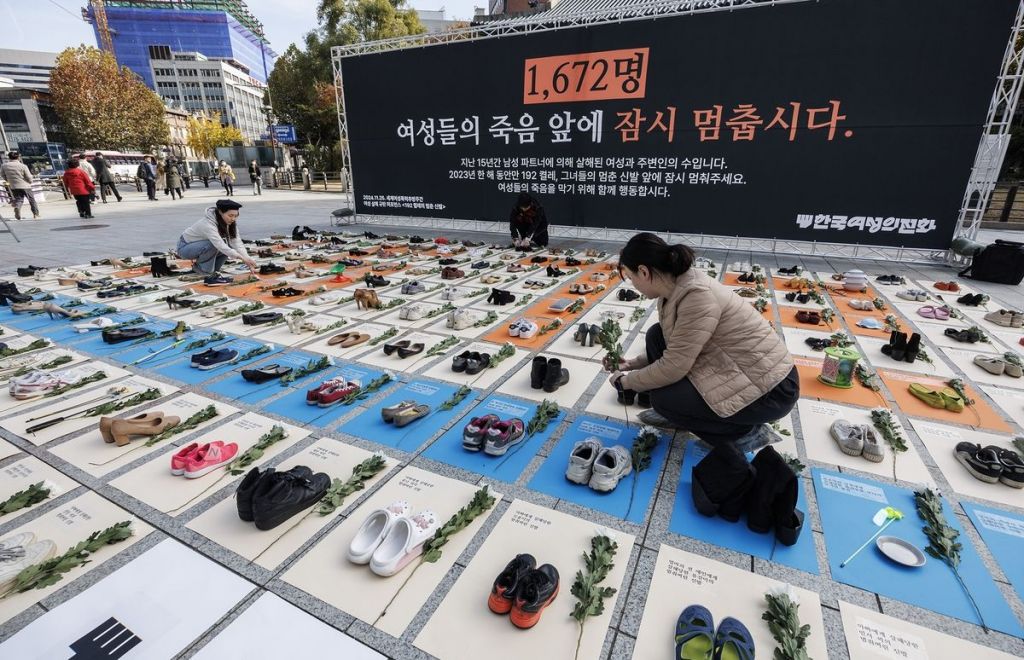 지난해 11월 한국여성의전화가 세계 여성 폭력 추방 주간을 맞아 진행한 '192 켤레의 멈춘 신발' 퍼포먼스. 연합뉴스