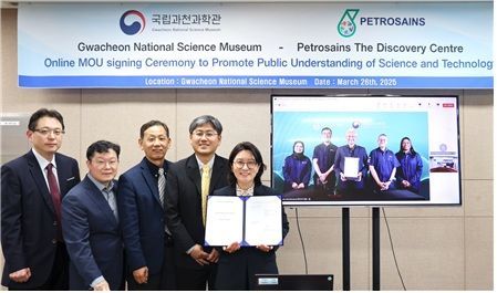 국립과천과학관과 페트로사인스 실무자들이 지난 3월 업무협약 체결 후 기념촬영하고 있다. 국립과천과학관 제공