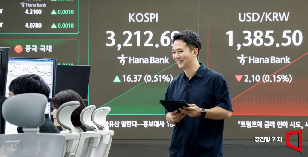 코스피 지수가 전 거래일 대비 12.48포인트 상승한 3208.80으로 장을 시작한 29일 서울 중구 하나은행 본점 딜링룸에서 딜러들이 업무를 보고 있다. 이날 원달러환율은 전 거래일 대비 2.6원 내린 1385원에 거래를 시작했다.