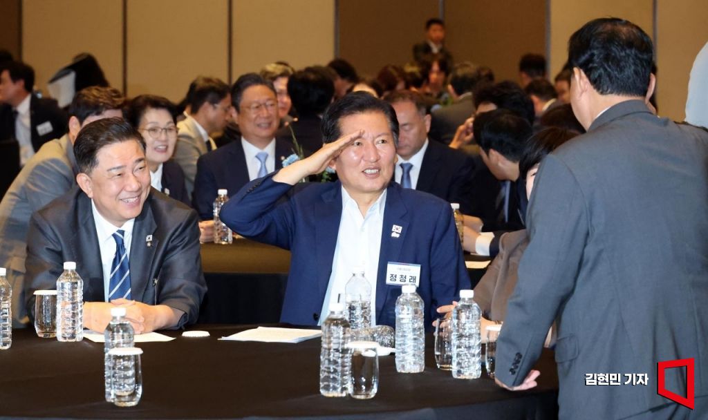 정청래 더불어민주당 대표가 29일 인천 중구 영종도 파라다이스시티호텔에서 열린 2025년 정기국회 대비 국회의원 워크숍에서 김병주 의원과 거수경계를 하고 있다.