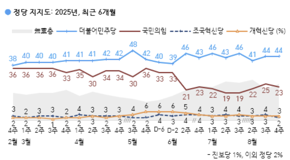 정당지지도에서는 민주당 지지율이 지난주와 같은 44%로 조사됐다. 국민의힘은 2%포인트 하락한 23%로 나타났다. 개혁신당은 3%, 조국혁신당은 2%로 조사됐다.