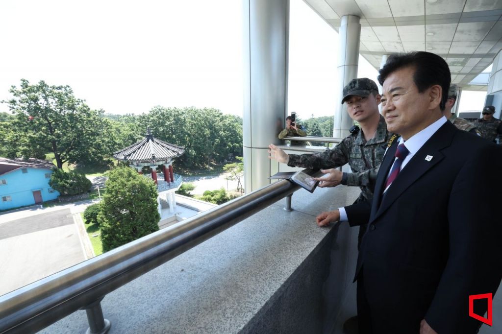 정동영 통일부 장관이 판문점 자유의 집에서 북쪽 판문각을 살펴보고 있다. [통일부 제공]