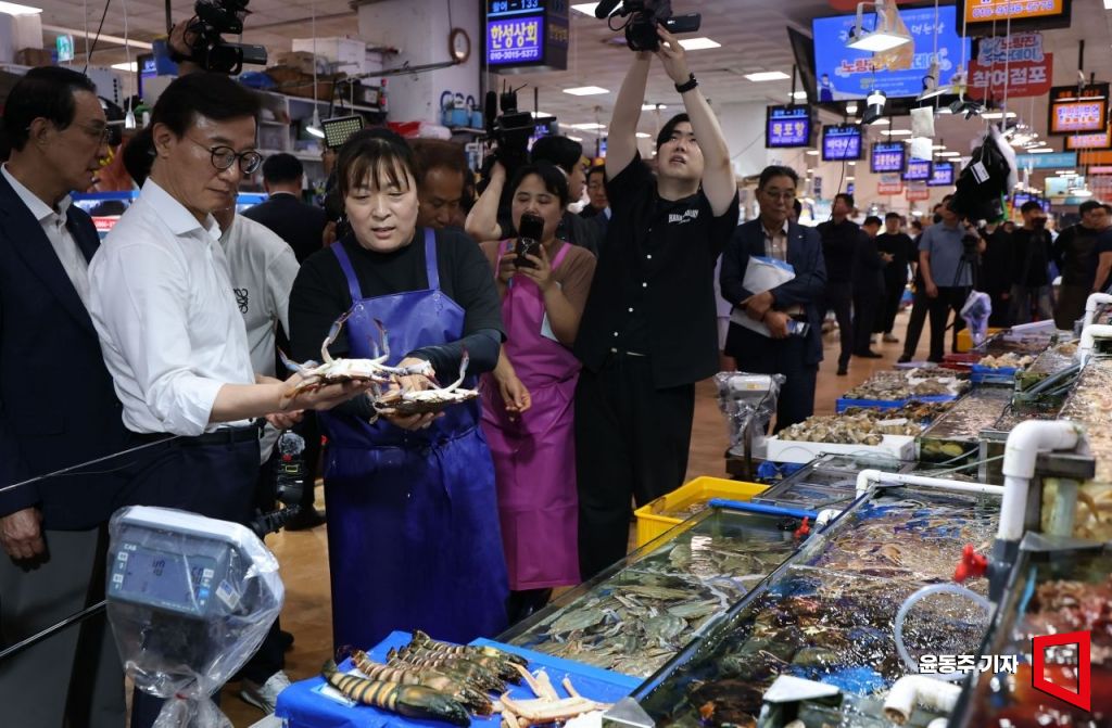 전재수 해양수산부 장관이 29일 서울 노량진 수산시장을 방문, 제철 수산물을 구입하고 있다.