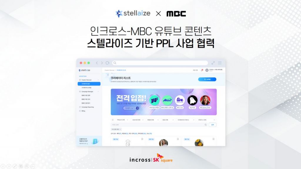 SK스퀘어 관계사인 디지털 광고 전문 기업 인크로스는 MBC 문화방송 사업제작센터와 인공지능(AI) 기반 콘텐츠 마케팅 플랫폼 '스텔라이즈(Stellazize)'를 활용한 PPL(Product Placement) 광고사업 협력을 위한 통합 계약을 체결했다고 29일 밝혔다. 양사는 이번 협약을 통해 디지털 광고 시장에서의 새로운 성장 동력을 확보하고, 공동의 이익을 증진하는 데 역량을 집중할 방침이다.
