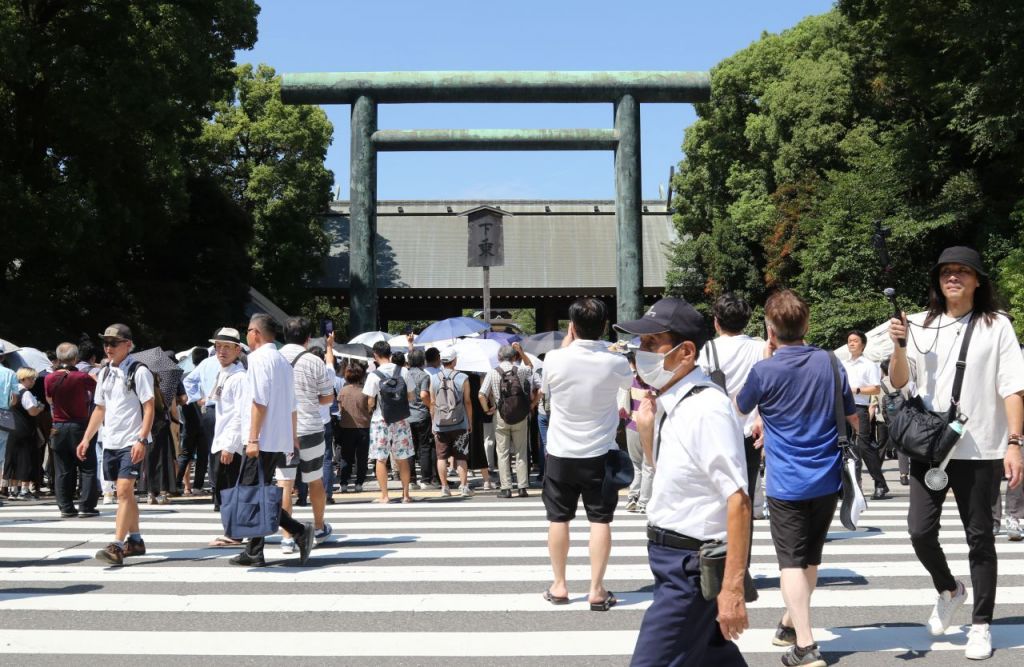 일본 극우 성향 정당 참정당의 가미야 소헤이 대표가 패전일인 지난 15일 일본 도쿄 야스쿠니신사 참배를 위해 이동하고 있다. 연합뉴스