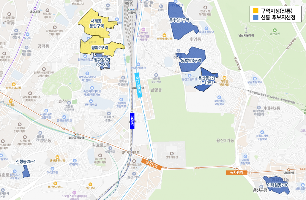 용산구는 서울시 핵심 정책인 ‘신속통합기획 주택재개발사업’에 적극적으로 대응해왔다. 지금까지 ▲청파2구역 ▲서계동통합구역 ▲동후암1·3구역 ▲한남1구역 ▲청파3구역 ▲신창동 29-1번지 ▲용산동2가 1-1351번지 등 총 8곳이 후보지로 선정됐다. 이 가운데 청파2구역, 서계동통합구역은 구역 지정을 마치고 조합 설립 등 후속 절차를 진행 중이다.