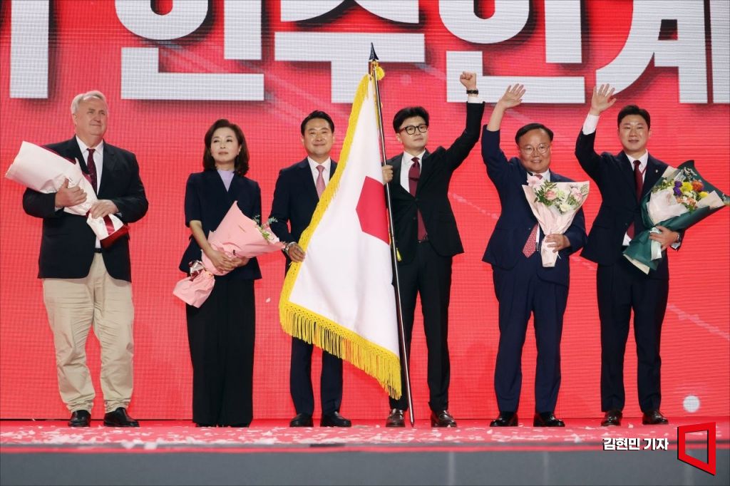 지난해 7월 당시 한동훈 국민의힘 당 대표 당선자가 장동혁 최고위원과 함께 당기를 들고 기념촬영 하고 있다. 김현민 기자