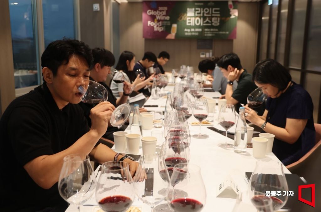 아시아경제 주최로 지난 28일 서울 영등포구 여의도 메리어트 이그제큐티브 아파트먼트에서 열린 '2025 글로벌 와인 앤 푸드 트립'에서도 하이라이트는 '블라인드 테이스팅'이었다. 올해로 4회를 맞은 글로벌 와인 앤 푸드 트립에는 신세계L&B, 금양인터내셔날, 아영FBC, 나라셀라, 국순당, hy 등 국내 주요 와인 수입사 6곳이 참여했다.