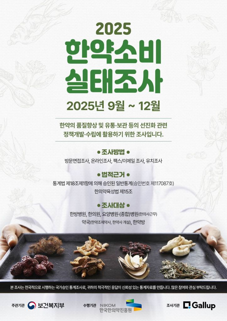 한국한의약진흥원은 한약 소비 관련 실태를 파악해 근거 기반 정책 수립에 활용하기 위해 9월부터 12월까지 '2025 한약소비 실태조사'를 실시한다.