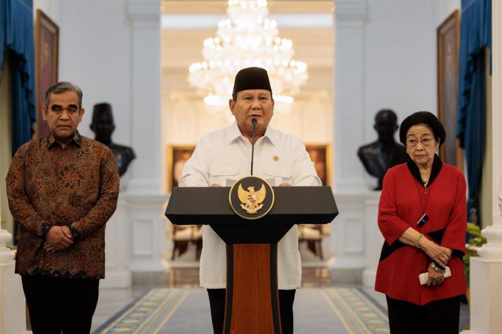 31일(현지시간) 정당 지도자들과 함께 기자회견 하는 프라보워 인도네시아 대통령(가운데). AFP연합뉴스